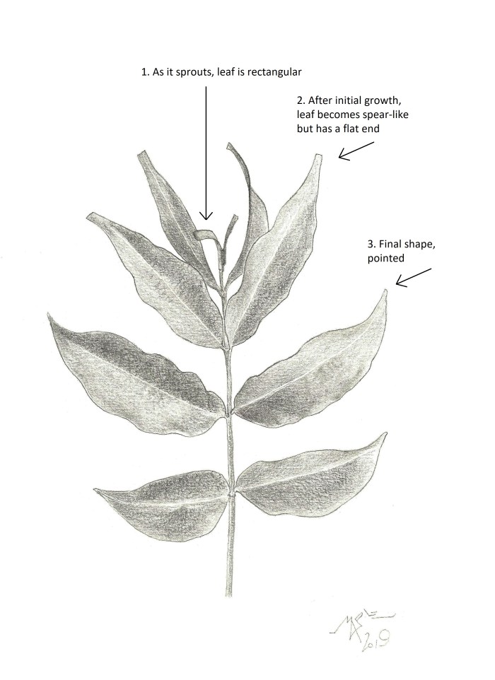 A curious fact is that, by sprouting at the edge of a branch, the just-sprouted leaves have a nearly rectangular shape. As they grow, the shape becomes truncate (abruptly ending with a flat end). Just as they grow further, they become lanceolate (spear-like).